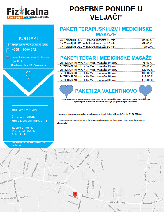 u mjesecu zaljubljenih za Vas smo pripremili posebne ponude s procedurama fizikalne terapije osluškujući Vaše želje i potrebe, i to sve kako bismo olakšali Vaše svakodnevne i kronične tegobe.