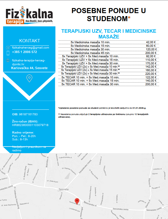 osluškujući Vaše želje i potrebe, u jesenskom mjesecu studenom pripremili smo posebne ponude s procedurama fizikalne terapije koje Vam najviše odgovaraju, i to sve kako bismo olakšali Vaše svakodnevne i kronične tegobe.